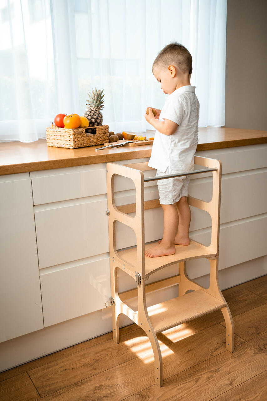 Toolile astudes ulatuvad lapsed köögitasapinnani ja saavad igapäevaselt koos vanematega köögis toimetada. Samuti on tool suureks abiks iseseisvalt hammaste või käte pesemisel.